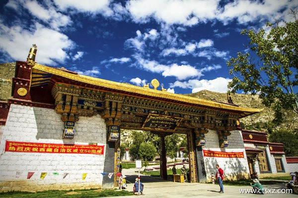 明永樂(lè)十七年(1419),宗喀巴弟子絳欽卻杰興建,成于宣德九年(1434)。后絳欽卻杰應(yīng)召赴北京,受封大慈法王?;夭睾髮J賜經(jīng)像等珍藏于寺內(nèi),至今仍存。寺內(nèi)有結(jié)巴、麥巴、阿巴三札倉(cāng)(經(jīng)院)。其全盛期寺中有僧8000余,規(guī)模略次于哲蚌寺。