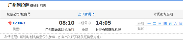 以上就是廣州飛拉薩的航班時刻表,起飛時間,到達(dá)時間,及固定航班日期。