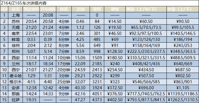 以上就是上海到拉薩Z164/Z165次火車的發(fā)車時(shí)間,到達(dá)時(shí)間,運(yùn)行時(shí)間,行程公里數(shù),途徑站及火車票價(jià)格。