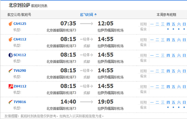 以上就是北京飛拉薩的航班時刻表,起飛時間,到達(dá)時間,及固定航班日期。